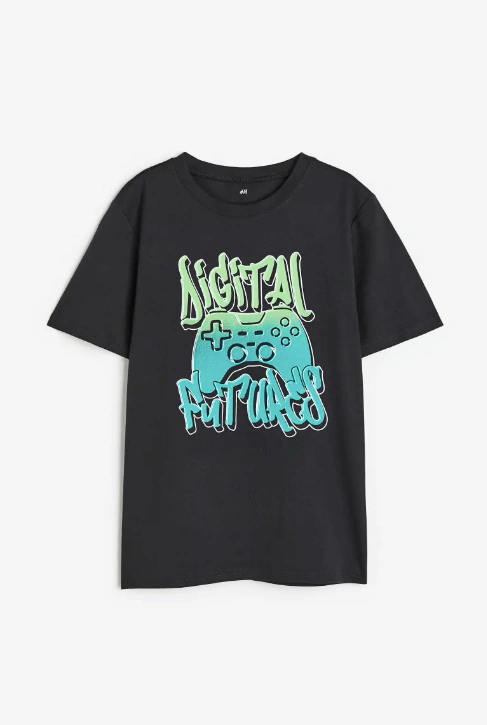 - > Remera "H&M" - Gris con joystick degradeé con verde