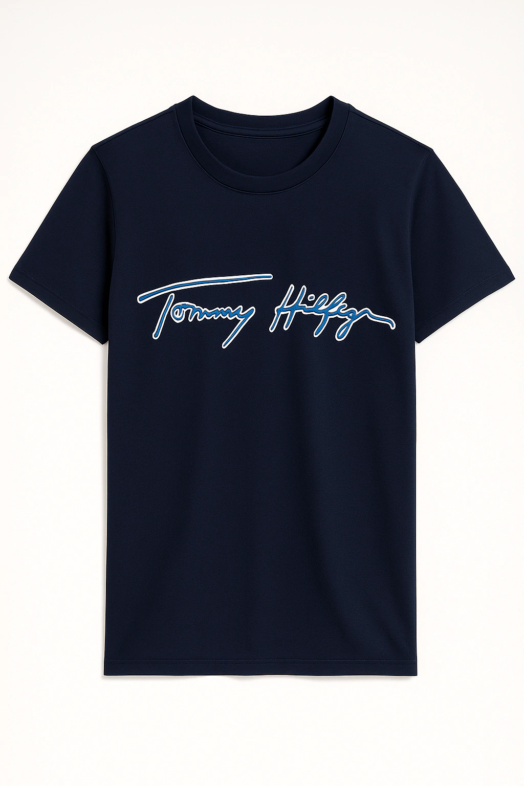 Remera "Tommy Hilfiger" - Azul marino con logo estampado letra cursiva